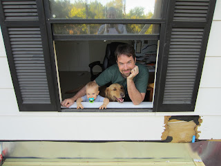 More progress on the porch today! They started putting up the support columns for the roof today. Tomorrow they are supposed to begin tearing off the existing roof so they can tie in at the ceiling height. It was bizarre to see people walking outside the window while I was at the computer this afternoon. :-) Isaac didn't mind, though! The guys occasionally wave or say "hi" to him when they see him. Since I know they notice him, I hate to be holding the camera up in the window trying to capture them working... Thus, we only take pictures at the end of the day.